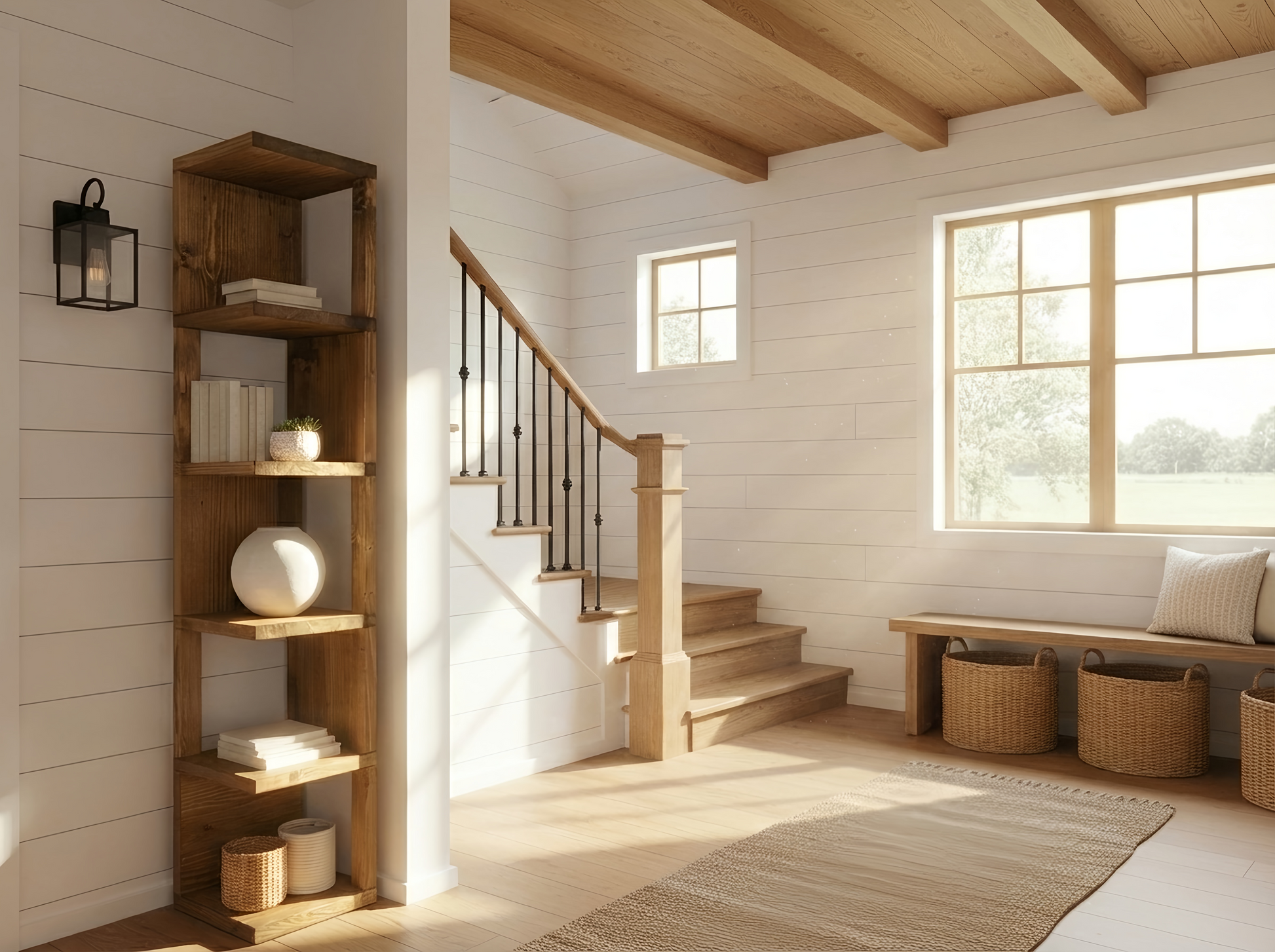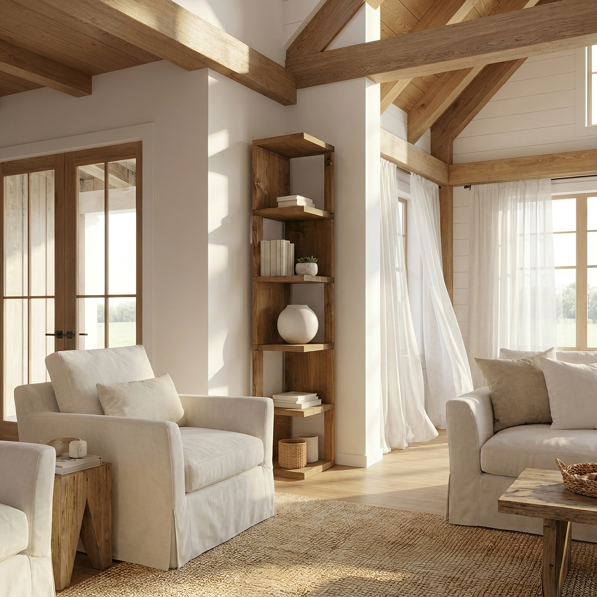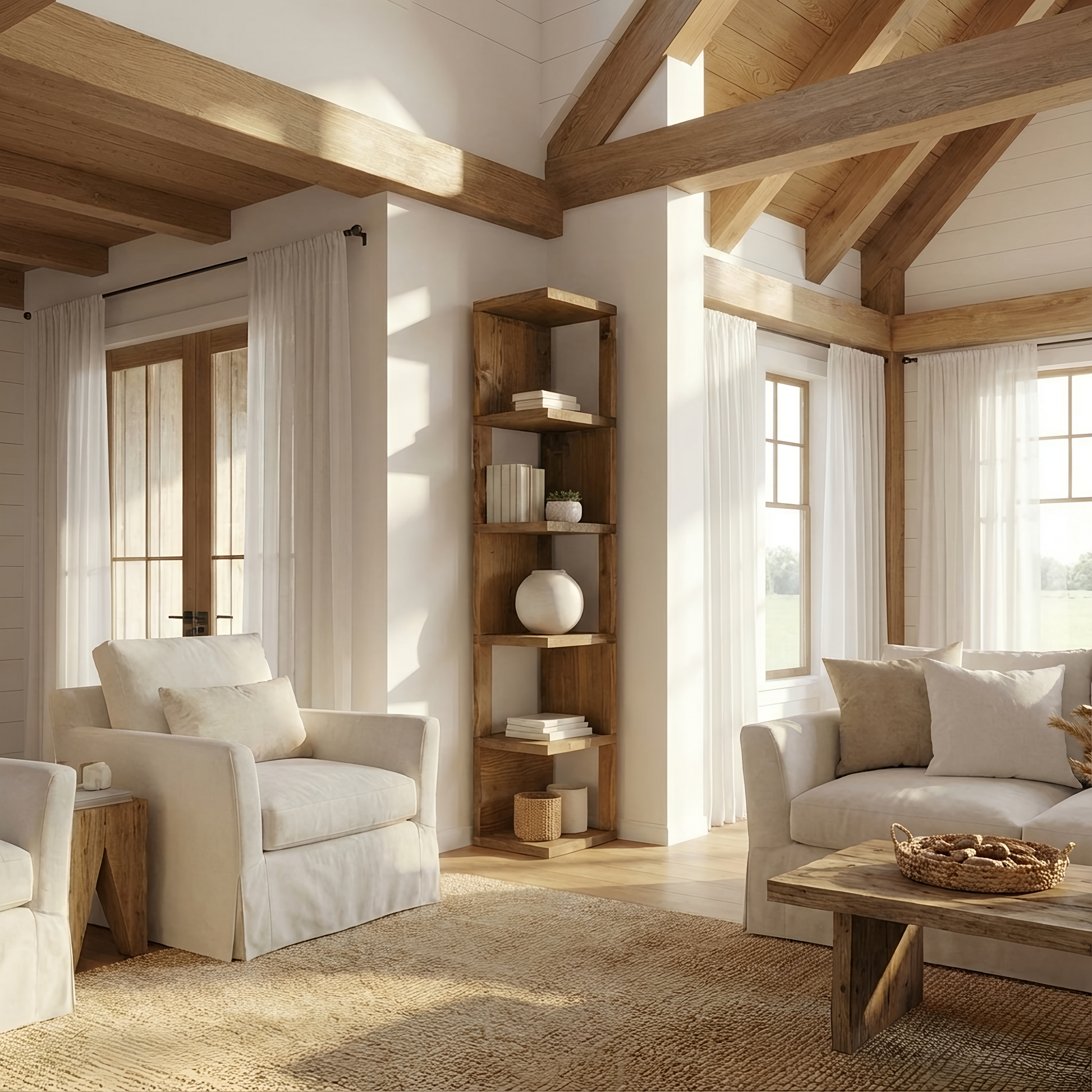 Solid Wood Corner Bookshelf – Natural Finish Open Bookcase, Rustic Scandinavian Design